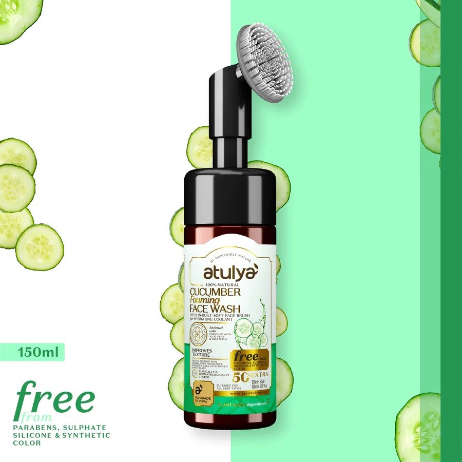 atulya Cucumber Foaming Face Wash contains cucumber extracts to help tone the skin while making it hydrated and fresh all day long. This face cleanser also has a built-in silicone brush for gentle yet thorough cleansing. Rich in anti-inflammatory properties, this foaming face wash calms irritated skin. It also functions as a moisture regulator, keeping skin nourished.