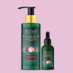 Red Onion Hair Oil: An authentic and soothing blend fortified with nurturing traits of Red Onion oil. It is a treat to dull and damaging hair, stimulating blood flow and regenerating hair follicles to accelerate hair growth. Red Onion Hair Serum: A simple yet effective formulation with livening qualities that is feather light and non-greasy. Gets absorbed deeply nourishing the scalp, and arresting hair loss and premature graying while adding volume and luster.