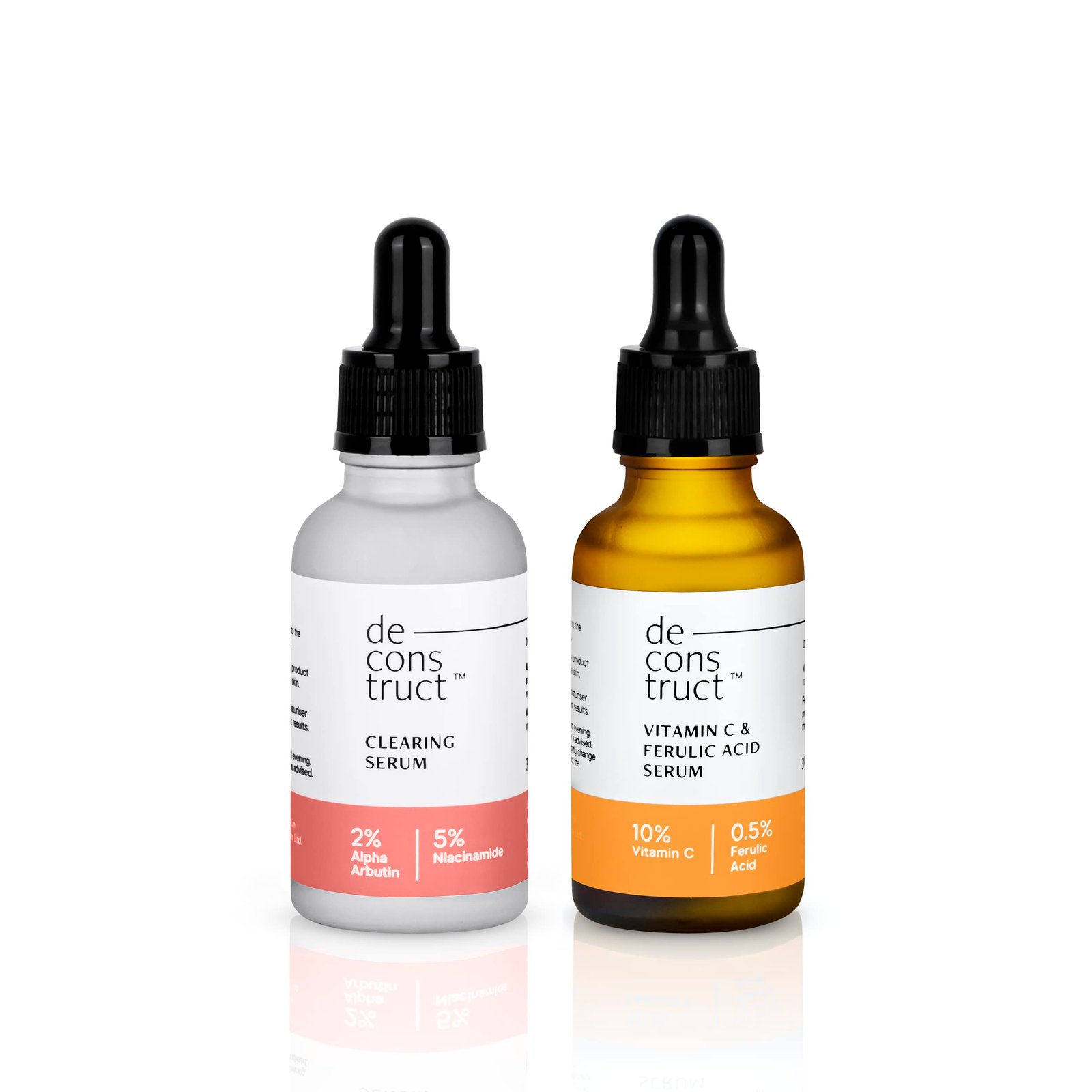 The brightening duo of Vitamin C and Clearing Serum is a potent duo to bring brightness to the skin. This duo prevents sun damage by suppressing the production of free radicals and reducing dullness & tanning.