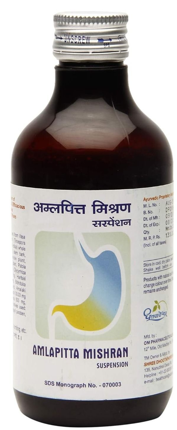 Amlapitta Mishran Suspension is herbo-mineral Ayurvedic proprietary medicine manufactured by Shree Dhootapapeshwar Limited, Mumbai (India). This medicine has gastro protective effect and is useful for acidity and gastric ulcers. Gastro protection means the protection of inner mucous membrane of stomach. It is the inner gastric mucosa that protects stomach and overcomes ulcer formation from digestive juice hydrochloric acid (HCl acid), secreted in stomach to digest food.