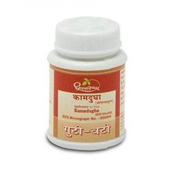 Dhootapapeshwar Kamdudha Plain Vati contains 1 part of each Pravala Bhasma, Shouktik Bhasma, Kapardika Bhasma, Shankha Bhasma, Shuddha Suvarnagairik, and Guduchi Satva as active ingredients.