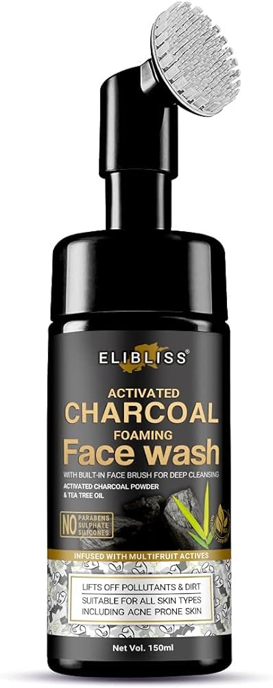 Elibliss activated charcoal foaming face wash with built-in face brush helps to refresh and revive tired, aging skin