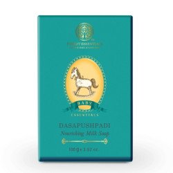 The Nourishing Milk Soap Dasapushpadi is a silken-smooth formula that gently cleanses the baby’s delicate skin while keeping it soft and supple. It is meticulously hand-crafted using Pure Desi Ghee (obtained from Cow’s Milk) and cold-pressed oils of emollient-rich Almonds, Kokum Seeds and Turmeric, which work together to leave the baby’s skin soft and supple.