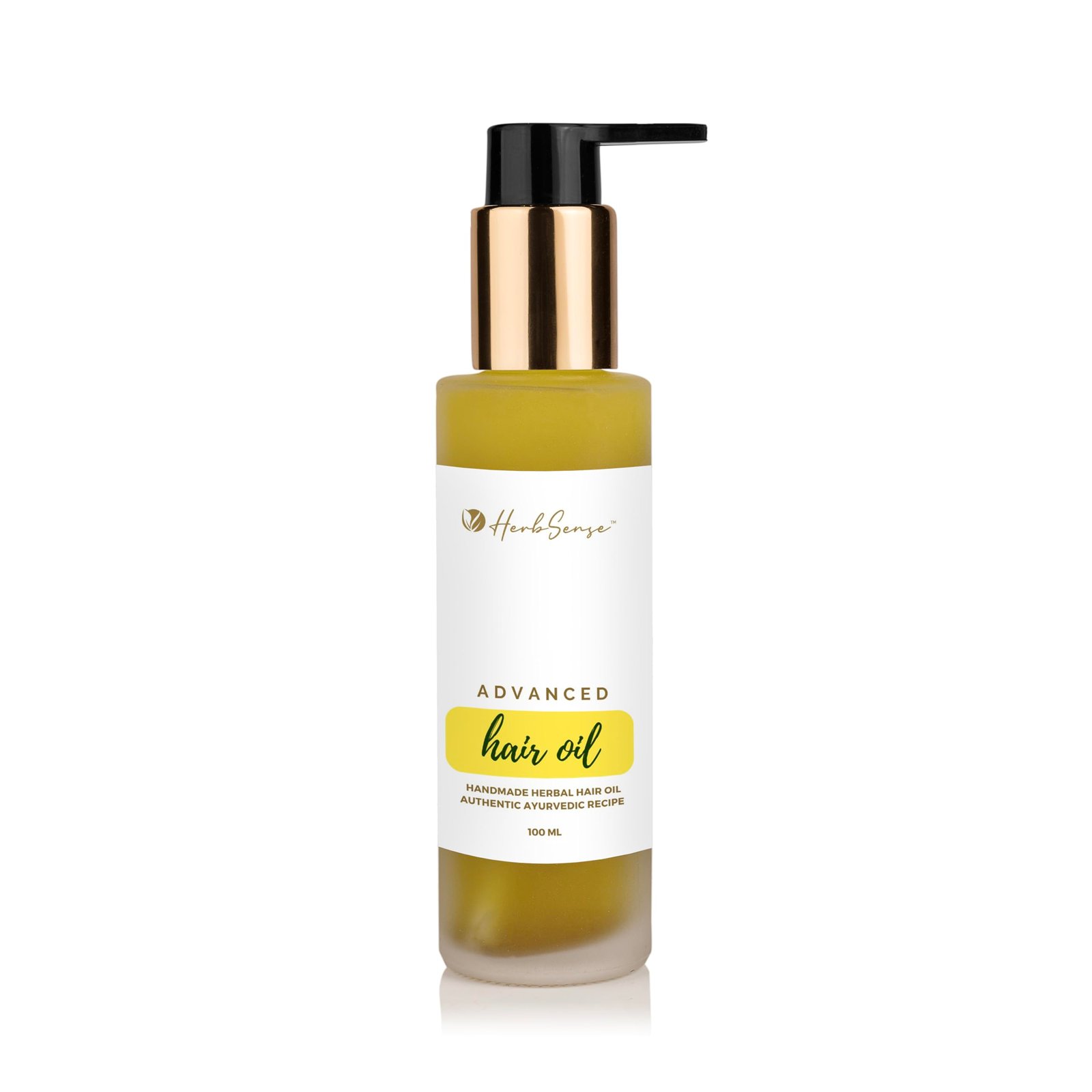 Herbsense Advanced Hair Oil is a special blend of ayurvedic ingredients, like Amla, Curry Leaves, Moringa, Beetroot, Black Seed, Fenugreek, Mustard, Neem, Almond, Coconut, and Sesame, for better hair health.