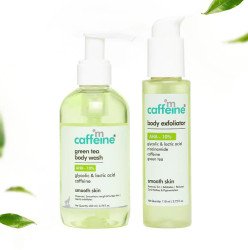 Treat bumpy skin, dark patches and tan with this easy 2-step routine! Skin Smoothing & Anti pigmentation AHA Body Routine is powered by 10% AHA and antioxidant-rich Green Tea & Caffeine. Wash off bumps & refresh skin daily with Green Tea & 10% AHA Body Wash. Reduce dark patches, strawberry skin & uneven skin overnight with Green Tea & 10% AHA Body Exfoliator. Get this duo today to reveal your smoothest skin yet!