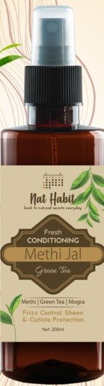Kitchen fresh Methi Jal prepared with deep soak & steam distillation of herbs & flowers. This conditioning ayurvedic hair mist is prepared with methi (fenugreek), green tea, mogra, mulethi, shikakai & patchouli that moisturise hair shaft and protect cuticles from opening and getting damaged