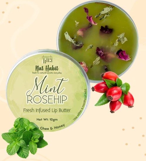 Kitchen fresh ultra moisturising Lip Butter made of Desi Ghee, Raw Honey and slow HEAT Infused mint leaves & rosehip. The Mint Rosehip lip butter is packed with the goodness of mint leaves, rosehip, desi ghee, eucalyptus honey, kokum butter, shea butter & pure cold pressed oils for express lip repair, moisturising nourishment and protection against aging, darkening, discoloration & pigmentation. ZERO chemicals & preservatives. ZERO mineral oil & paraffins.