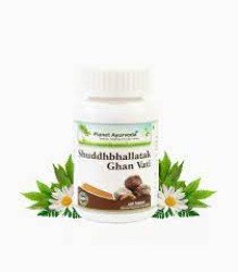 Shuddhbhallatak ghan vati is an mesmerizing formulation prepared in the house of Planet ayurveda by purifying shuddh bhallataka (Semecarpus anacardium) as its main ingredient. Bhallatak is also known as marking nut in common language and is an amazing kapha and vata balancer. It possesses medhya, vahani kara, arsh hara, vranhara and bhedi properties and aids in sustaining all kinds of nutritional needs of the body. Shuddhbhallatak ghan vati maintains the balance between the three humors of the body and provides rasaynik effect.
