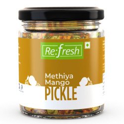 Refresh Methiya Mango Pickle is a traditional pickle made with raw mango pieces and fenugreek seeds. Its spicy and warm taste can leave you craving for more.