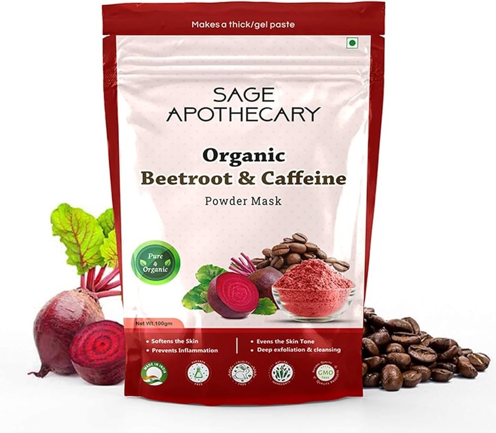 Sage Apothecary Organic Beetroot & Caffeine Powder Mask is rich in antioxidants, calcium, iron, potassium, and manganese, along with other nutrients. Caffeine possesses anti-inflammatory properties that make it useful in reducing inflammation. It is suitable for all skin types. Reduces pimples, acne, and heals your skin. Sourced from natural ingredients, this will surely benefit you in the most wonderful way possible.