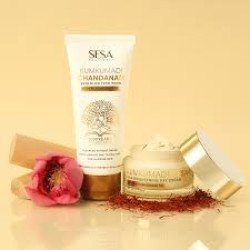 This combo contains Sesa Kumkumadi Chandanam Skin Glow Face Wash and Kumkumadi Kesar Skin Brightening Day Cream.