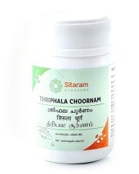 Triphala choorna improves gut health and motility; Relieves constipation and excessive acidity; Improves vision acuity; Cleanses skin and scalp, keeps away infection; Rejuvenates and detoxifies.