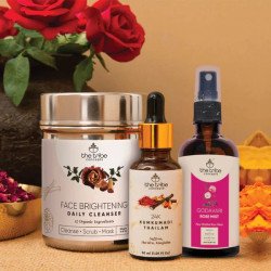 CTM (Cleansing, Toning, and Moisturizing) Routine Kit for radiant skin. This kit includes our refreshing Godavari Rose Mist, rejuvenating 24K Kumkumadi Thailam, and a gentle Face Brightening Daily Cleanser. Achieve a brighter, blemish-free, and glowing complexion with this essential trio.