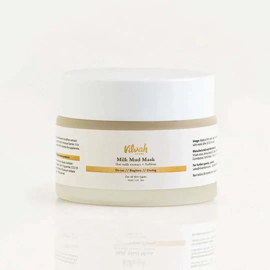 vilvah stores milk mud mask:Vilvah’s Milk Mud Mask promotes instant brightness and glow to your face. Oat milk extract & saffron extract visibly improves skin texture, refine pores, and support the skin‘s moisture barrier. It is recharged by antioxidant complex from oat milk extract which restores the suppleness of your skin, leaving it firm and toned. Great for blemish-prone skin, white clay helps to draw out impurities and improve oil control.