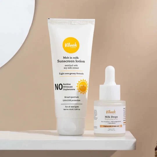 Vilvah Stores Skin Brightening Combo : Treat and protect your skin everyday using our Milk drops brightening serum along with our Melt in milk sunscreen lotion SPF 50 to boost skin hydration & improve skin barrier that prevents from premature skin aging.