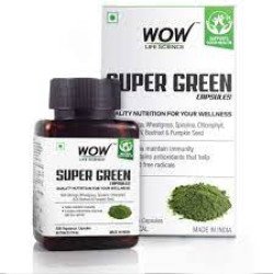 WOW Life Science Super Green Capsules with moringa, wheatgrass, spirulina, chlorophyll, apple cider vinegar, beetroot & pumpkin seed. The blend of these ingredients helps to maintain heart and liver health, fight free radical damage, and manage gut health. They are a rich source of nutrients, proteins, and minerals. Every capsule of WOW Life Science Super Green pack contains a 550mg blend of signature, potent formulation for your wellness. 60N Vegetarian Capsules per pack