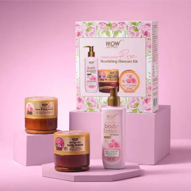 WOW Skin Science Himalayan Rose Gift Box revives your dry, oily, dehydrated and sensitive skin and perks up your senses with the exotic smelling. A Nourishing Skincare Kit, it exfoliates, smoothens and tones the skin. Our himalayan rose face and body scrub helps improve the skin renewal process by removing dullness, toning and moisturizing skin and restoring natural softness and suppleness. It delivers the skin-reviving goodness of Walnut Shell Powder, Rose Water, Beetroot Extract blended with Sweet Almond Oil and Moroccan Argan Oil. Our himalayan rose body lotion is made with the rejuvenating infusion of rosewater, beetroot extract, hyaluronic acid and sweet almond oil that goes deep inside the skin leaving it velvety smooth and moisturized. Our himalayan rose body butter delivers the goodness of minerals in rose water to help balance skin and improve supplenes