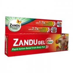 Zandu Gel Description : Effective on Backache, Knee pain, Joint Pain, Muscle & joint pain & sprains Zandu Gel Composition : M. Salicylate:17.00%, Menthol:11.50%, Karpoor:2.00%, Nilgiri Tel:2.00%, Tarpinka Tel:0.50%, Lavangka Tel:0.50%, Ginger oleoresin:14 % WS 0.20%, Benzyl Alcohol ( Preservative) 0.50%, Rosemary oil 1.00%, Vitamin E nicotinate:0.08%, Flax seed oil (Atasikatel):3.00%, Ajowankaphool:0.20%, SallakiGuggal:2.00%, Capsicin Extract:0.02% Zandu Gel Dosage : It can be taken on fingers or applied directly onto the affected areas. Then, to be massaged gently on the skin over the affected areas.The product should be applied 3-4 times a day for as long as the pain persists. Zandu Gel Uniqueness : 2.7 x better relief from back pain 1.7 x better relief from knee stiffness It starts acting in 2 minutes which is signalled by change in colour of the gel